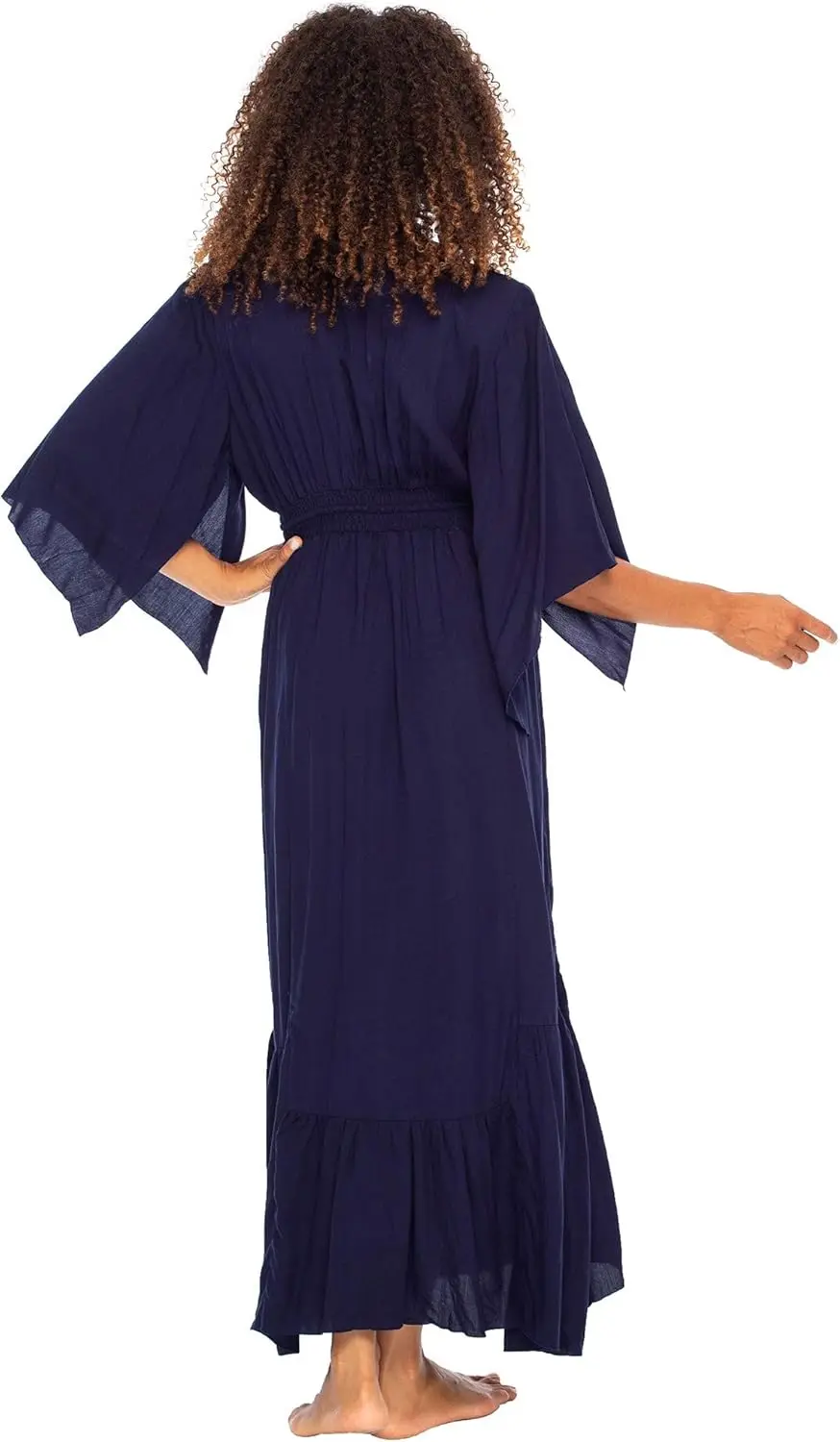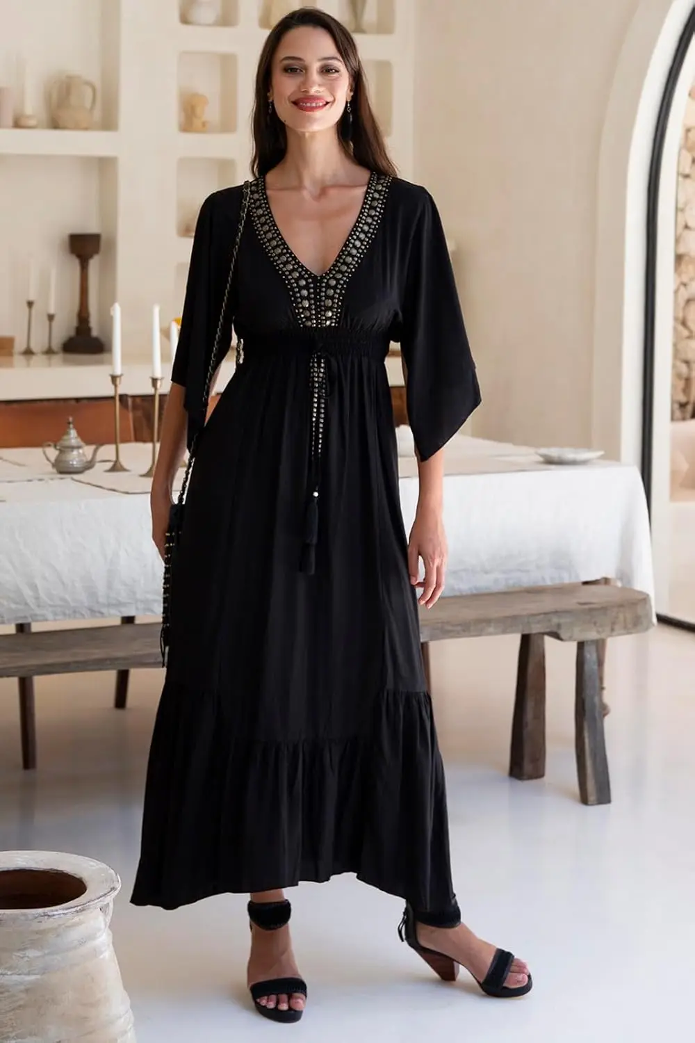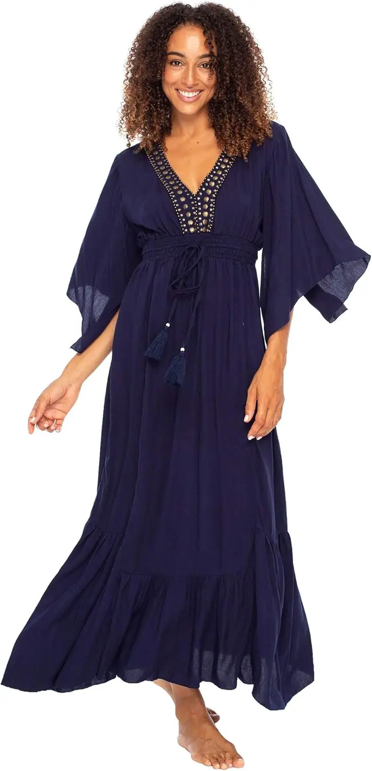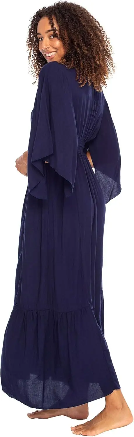 Women's Casual Boho Maxi Dress Deep V Neck Bali's Long Flowy Summer Sundress Natural Waistline Lace Chiffon Washable Plain Dyed